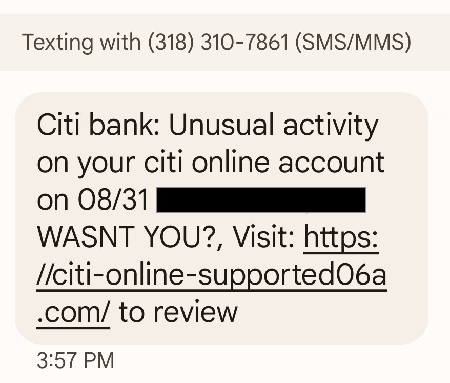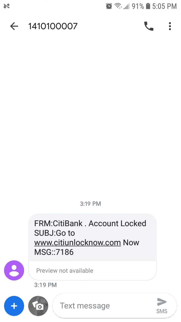 In Feb. 2020, I saw this scam text message on a phone. The domain citiunlocknow.com does not belong to Citibank.