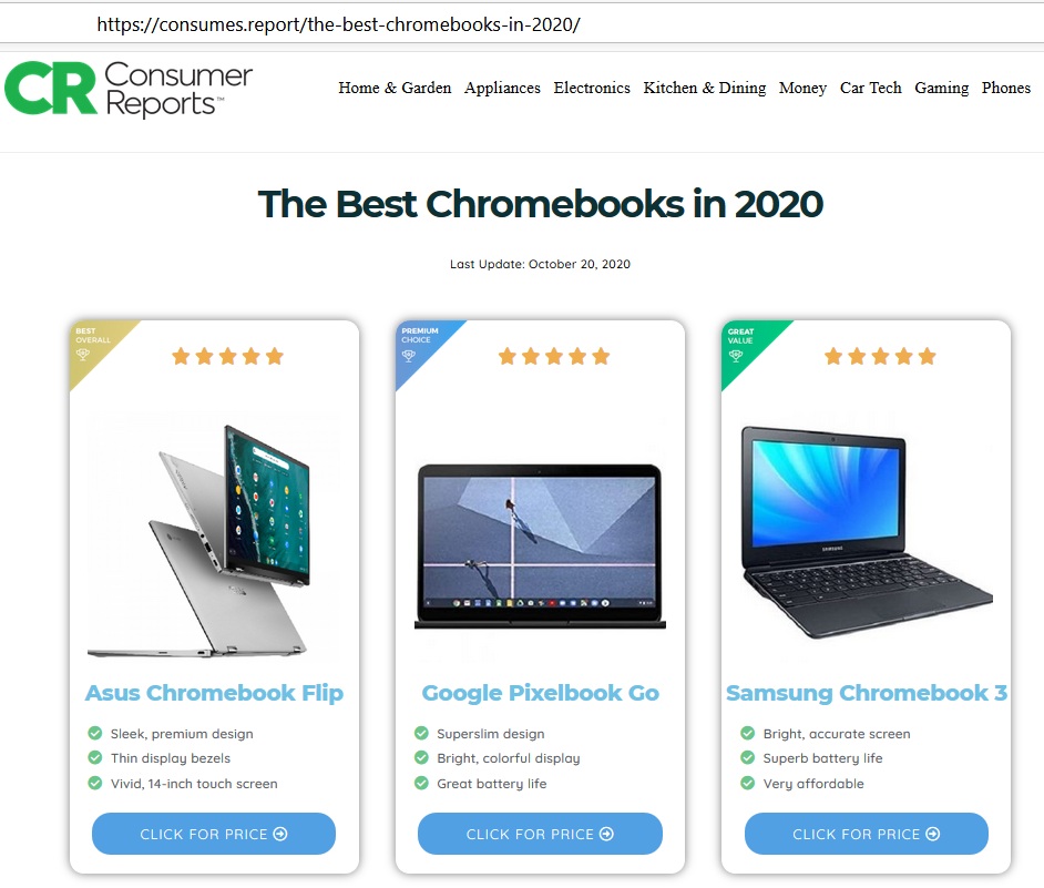 In October 2020, I was searching for a specific Chromebook and one of the top search results was the website consumes.report. It is a scam (see screen shot), pretending to be Consumer Reports. Their real domain name is consumerreports.org.