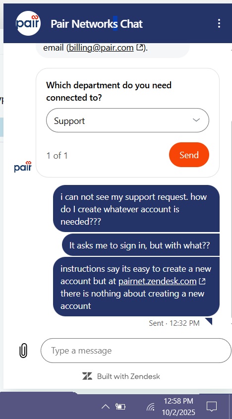 - Maybe avoid Pair.com. I used them for many years but as of September 2025, something has clearly changed. I get a bill that is four times larger than before. I submit a ticket asking why, as the billing invoice does not break down the assorted charges. There is a new ticketing system that requires a new account with Zendesk. But, there is no way to create a Zendesk account. So, I used their chat to ask how to create a Zendesk account, and no one responds to the online chat.