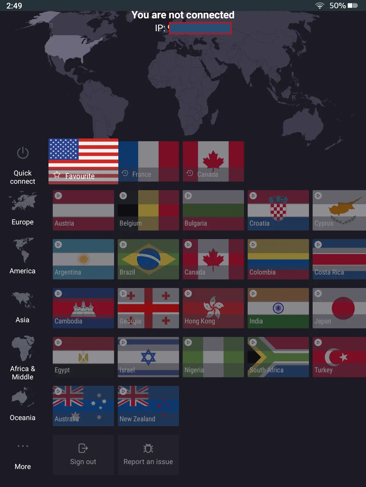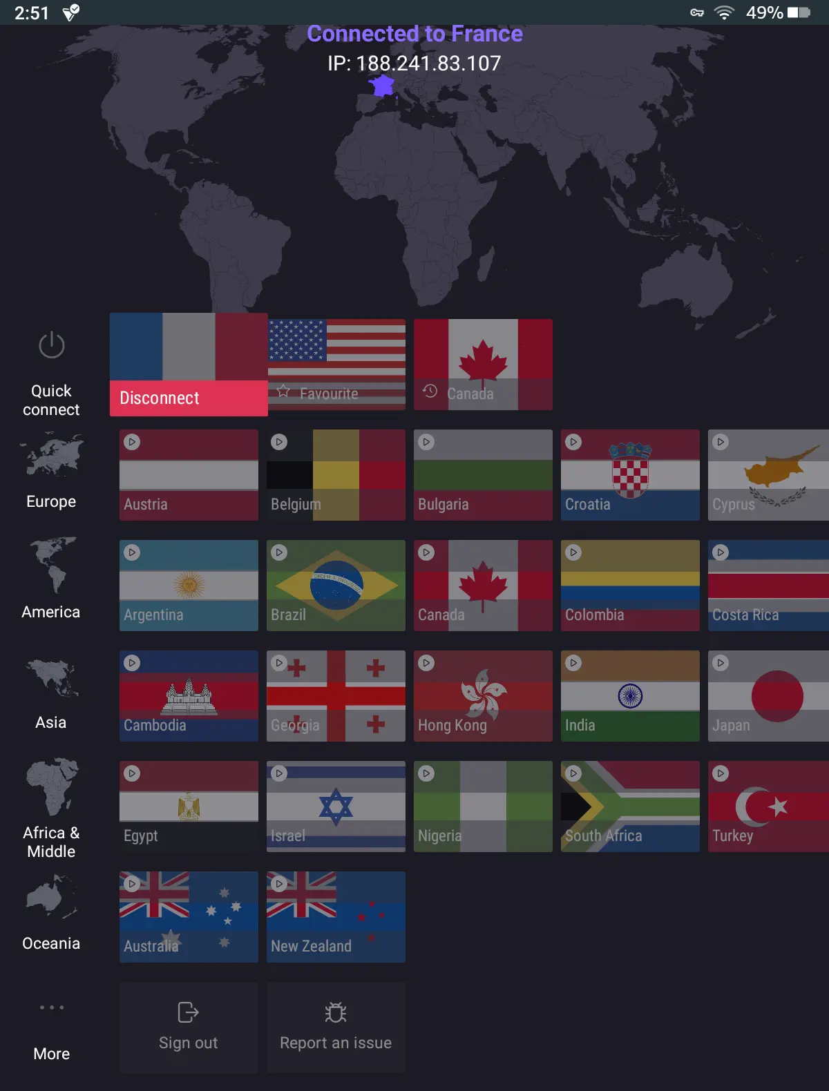 Speaking of toggle options, they are too hard to toggle. The slider is much too small. The list of servers is presented in geographic sequence by default, which I find sub-optimal. I suggest changing the sort order to Latency so that countries near you sort to the top. That said, this sequencing is far from perfect. Eventually the sorting sequence won't matter to you as you can set Favorite VPN servers that display in their own section of the app. That said, I have lost my favorite VPN servers many times, the last time a password reset wiped them out.