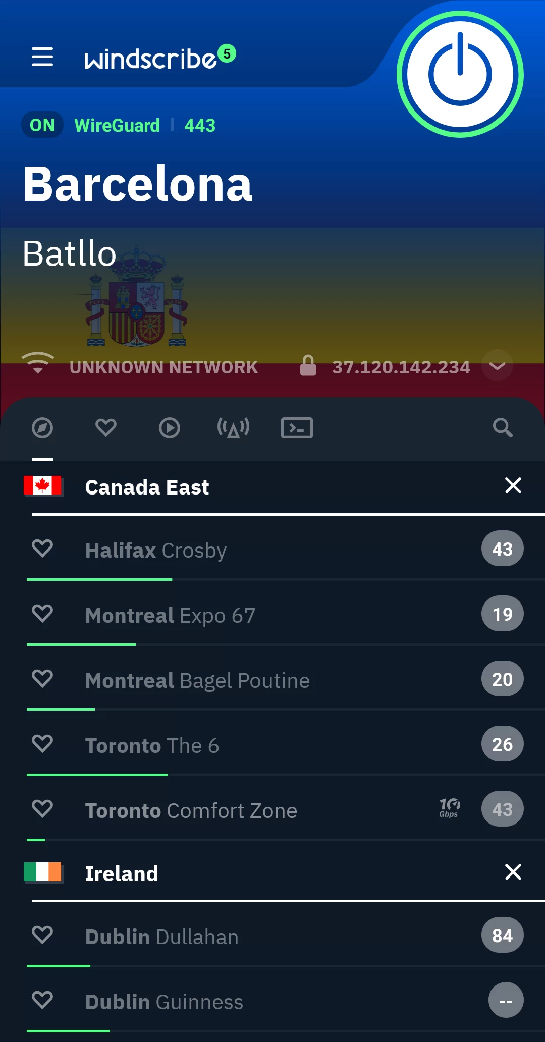 The lack of explanation is a huge issue. Before connecting, some servers have a number next to their name which I assume is the ping time. I have to assume because there is no column heading in the display. Some servers have no number, what that means is a mystery. When I connect to a VPN there is a huge warning "This network is unsecured". What that means, I have no idea. It is not even clear if the message refers to the local Wi-Fi network or the VPN server it is about to connect to. The expanded explanation under this message is: "Unknown is unsecured, meaning you don't wish to use Windscribe while on this network" WTF? After a few times, the "unknown" was replaced with the SSID in my home, so its not complaining about the VPN server. What does it think is wrong with my home network? No idea. Its WPA2 Personal and, trust me, quite secure. While connected to the VPN, the app provides no information at all. For assorted toggle switches, the app uses black/white to indicate OFF and green/black to indicate ON.