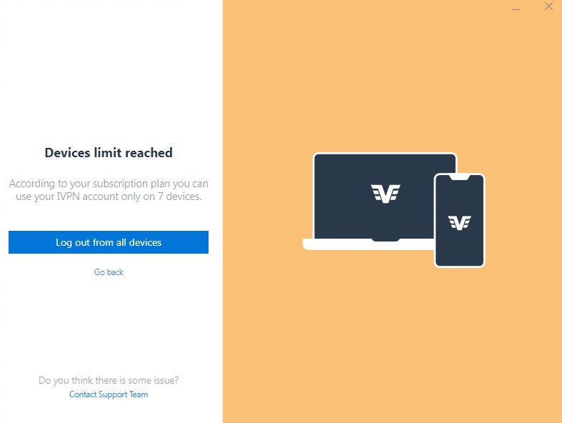 Device Limits: There is an introduction to this topic on the main VPN page here. As of December 2023, the IVPN Standard plan allows for 2 devices, their Pro plan allows for 7. This screen shot shows what it looks like on Windows when you are using all your REGISTERED devices when you try to connect to IVPN from a new device. And, also on Windows, this screen shot shows what happens to a previously REGISTERED device after it has been DE-REGISTERED to allow the new device to connect to the VPN.