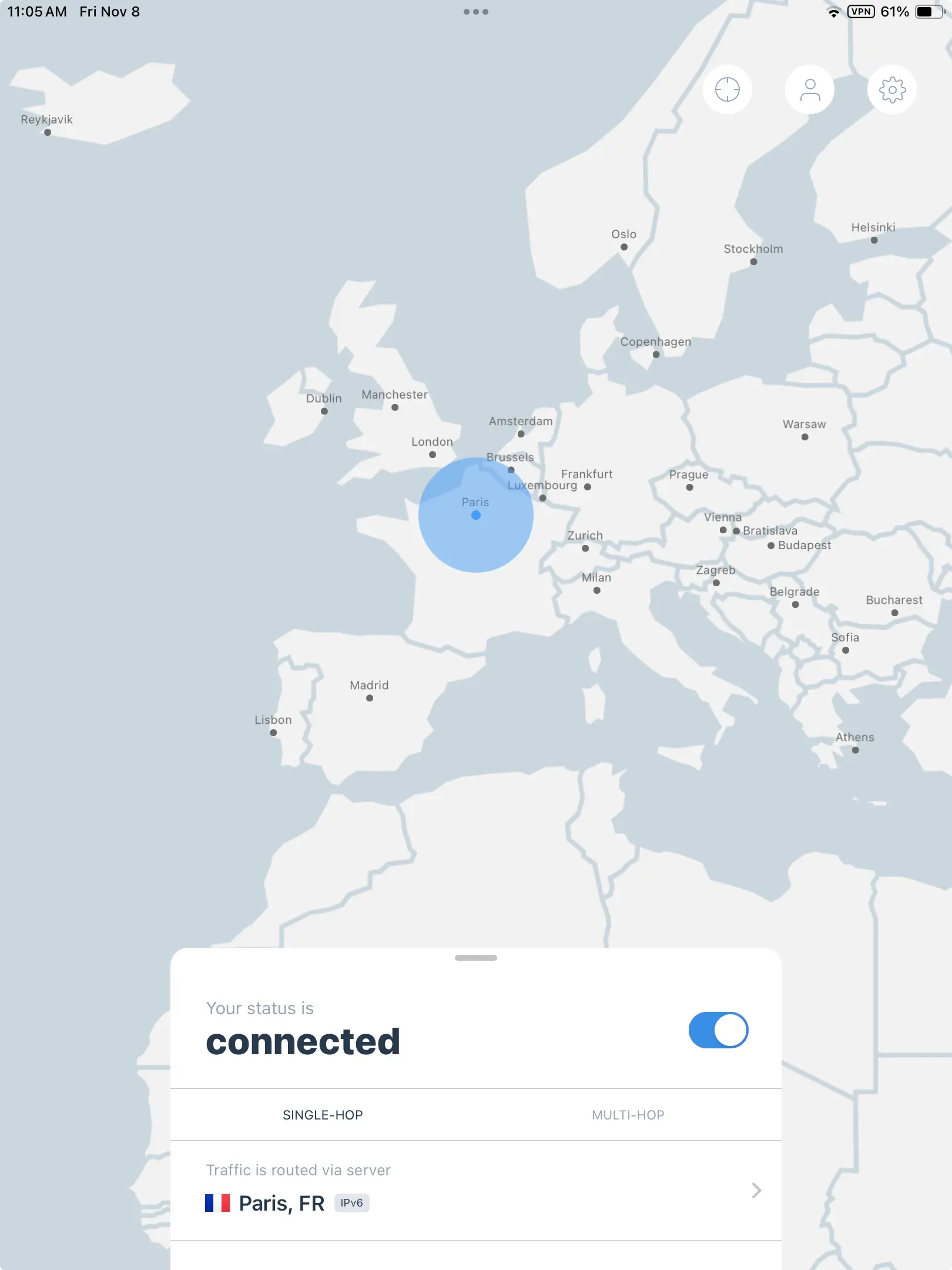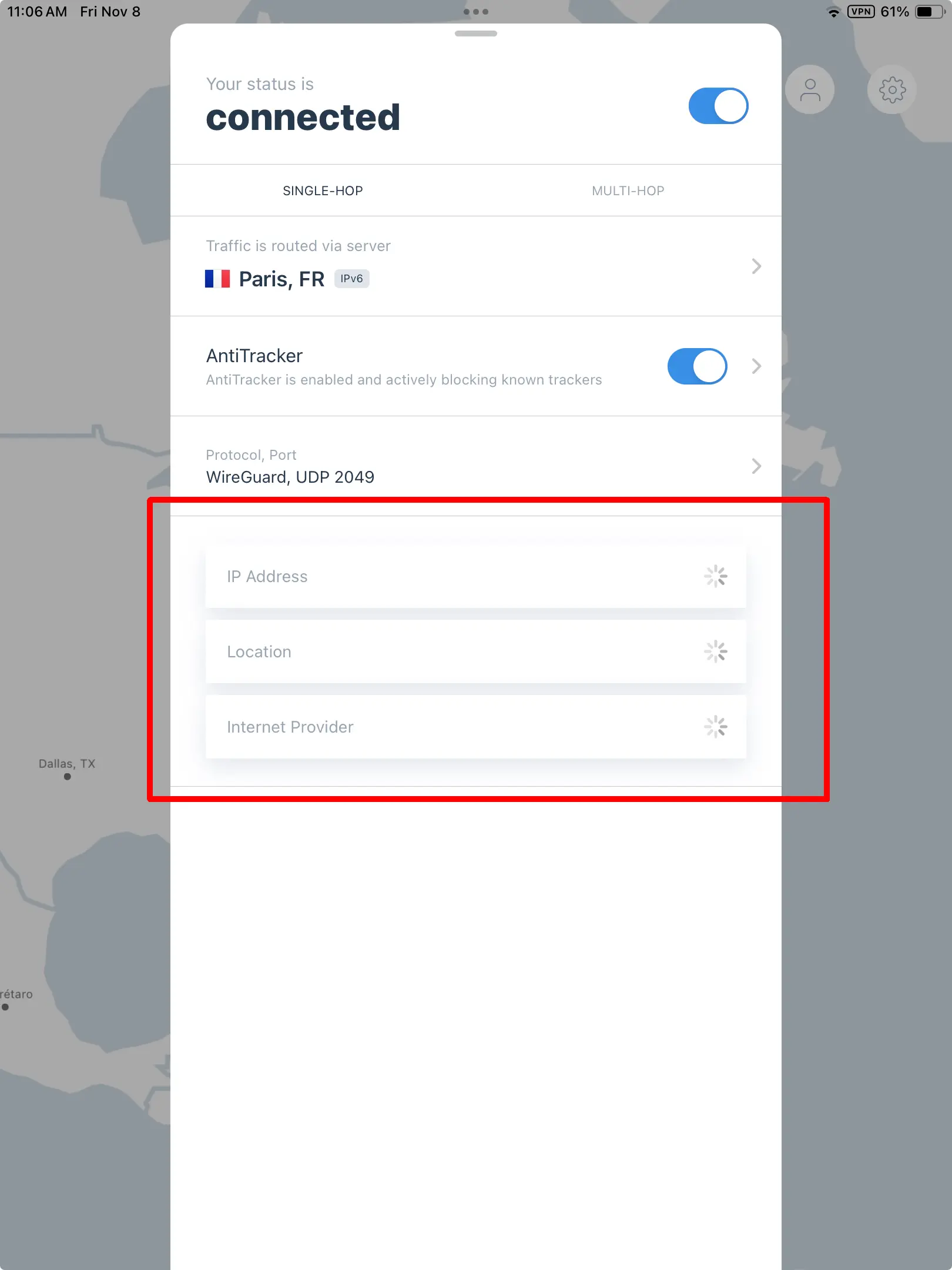 --While connected: it shows the city, country and IP address of the VPN server (screen shot). It also shows how many minutes you have been connected. Nothing else. There is no speed or bandwidth information. It is annoying that the blue circle rotates all the time. On Windows, a similar blue circle only rotates when making a connection, then it stops once connected.