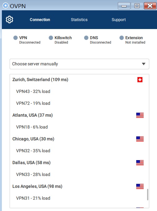 --Features: The interface for picking servers manually is great, it shows both how busy each server is and the ping time to the server (screen shot). On the other hand, the scrollbar for scrolling through the list of servers is much too narrow. It can also chose the best server in a country of your choice, or just chose the best server, period. Once connected, there is no indication of how busy the server is. Usually you can pick individual servers to connect to, but on one computer, it only let me connect to the best server in a specified country, not sure why. There is a question mark next to every configuration option that takes you to a dedicated web page with an explanation of what that option is. Great. (screen shot). There is a Support feature that lets you describe a problem and report it to them, optionally with logs and diagnostic data. Nice touch. There is also a button to show the log files. The software keeps two different types of logs on your computer. The Kill Switch is on by default (good). IPV6 is off by default (good). Launch on boot is on by default (not my preference). The software supports OpenVPN and WireGuard. OpenVPN is the default and it can run with either UDP or TCP which is pretty standard. Only a single port is supported for OpenVPN (but they are different for UDP and TCP). While connected, the app has two different graphs of bandwidth usage. There is an icon in the system tray. When connected, it is green, when disconnected it is yellow. Good choice of colors. When connected with OpenVPN, you can not access devices on your LAN. Tech support was great when I asked about this, they said that with the WireGuard software from WireGuard, you can connect with LAN devices. I did not try it.