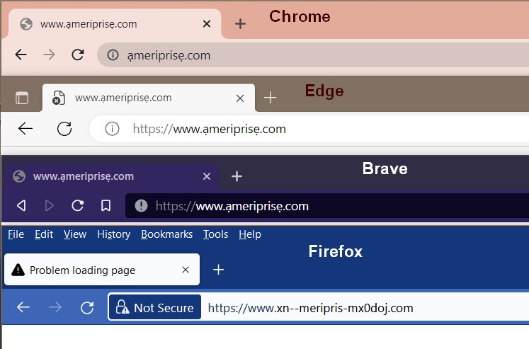 EXAMPLE One malicious domain in the above article is www.xn--meripris-mx0doj.com which translates to www.ameriprise.com In November 2022, I tested current versions of four web browsers (in Windows) to see how they would display this. As you can see here, only Firefox offered a visual clue of the scam. Chrome, Edge and Brave assist the bad guys by displaying a spec of dust below the a and e. |
