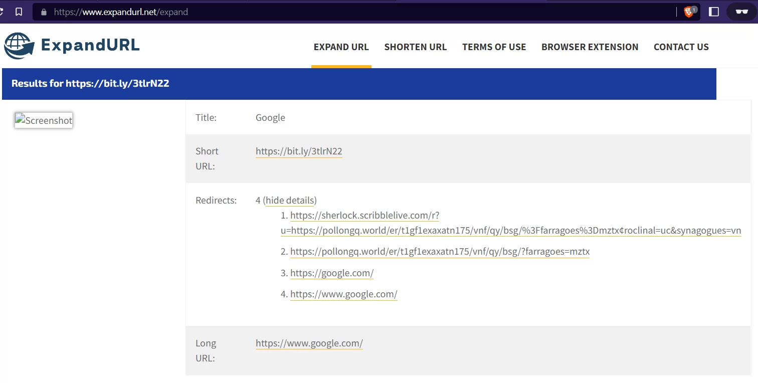 Testing it with different link expanders showed different results. This link gets re-directed more than once. The first re-direct is to sherlock.scribblelive.com and then to pollongq.world before ending up at google.com, of all places. Some link expanders only show the ultimate destination, hiding the intermediate re-direct URLS. Better ones showed the intermediate re-direct locations.