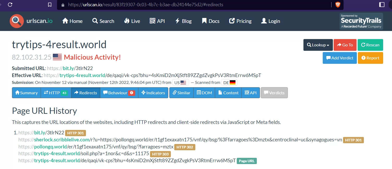 The best result, with my test URL, was from urlscan.io. See it here. URLscan was the only service that did not report google.com as the ultimate destination. It did show the same first two re-directs (sherlock.scribblelive.com and pollongq.world) as all the other services, but it showed the ultimate destination as trytips-4result.world which it flagged as malicious. You can see the re-direction trail here and here.